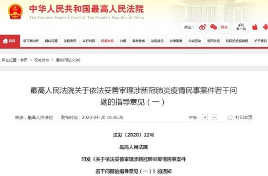 4月20日,最高人民法院公布《關于依法妥善審理涉新冠肺炎疫情民事案件若干問題的指導意見(一)》。《意見》共十條,涉及充分發揮司法服務保障,準確適用不可抗力規則,依法妥善審理合同糾紛、勞動爭議等案件,適用懲罰性賠償,訴訟時效中止和訴訟期間順延,加大司法救助與企業幫扶等內容。